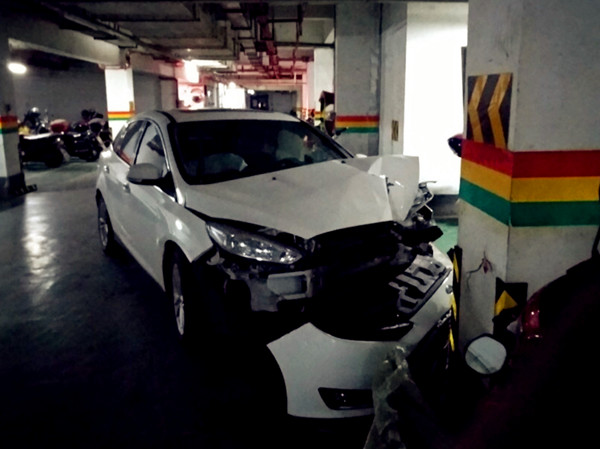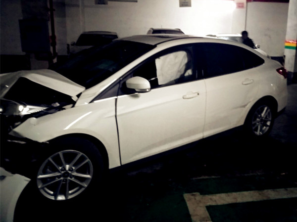 私家车撞上车库方柱 车头扭曲安全气囊弹出