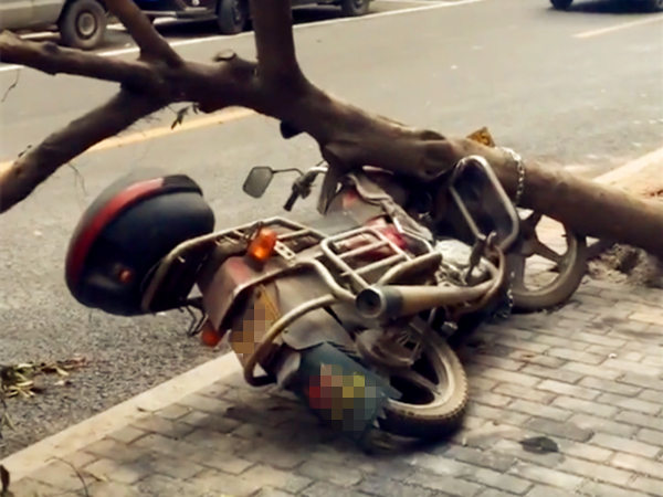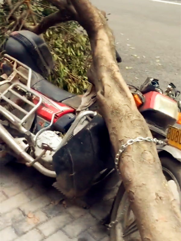 车主将摩托锁在树上 结果树倒了
