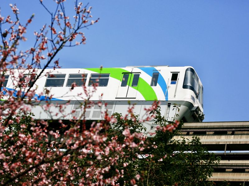 樱花、桃花、梨花、玉兰、紫荆… …纷纷绽放。在中华美德公园里,欣赏着美景,看轻轨从头上疾驰而过;在车厢里,俯瞰整个公园,绿树成荫,红叶白花点缀其中。