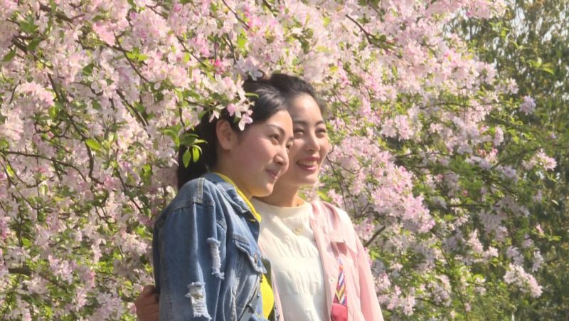 走进校园,一排排海棠树铺满了艳丽的花朵,从远处看,一棵棵海棠树就像是一个个粉红色的大绒球,在微风的吹拂下摇曳飘动,十分美丽。近看,海棠花白里透红,美艳动人,它们三五朵一簇生长在枝杈上,就像是一束束精致包装的鲜花,吸引了众多市民和校友前来赏花拍照。其中,不少老校友时隔多年重回母校,看见这番情景,更是难掩激动之情。
