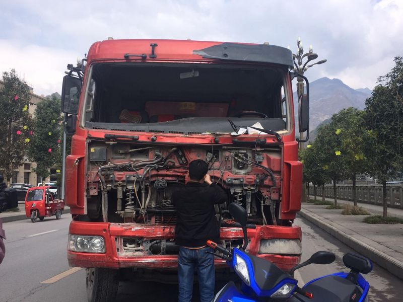 记者在事故现场看到,大货车车头受损严重,车窗玻璃洒落一地,道路旁的一个路灯被连根撞翻,砸坏了护栏。因货车冲击力过大还导致一旁的路沿、行道树也不同程度受损。