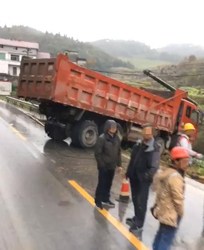 11月26日,有涪陵的网友反映称,在沙树湾附近,一辆货车撞断了路边的电线杆,险些冲出路面坠下山坡,而横倒在驾驶室前面的电杆恰好拦住了货车,电缆高度不足以让大货车通过,当地村民就找来一个木棒将电缆支撑起,让车辆通行。而村民也表示如果想要通过就得缴纳5元通行费。