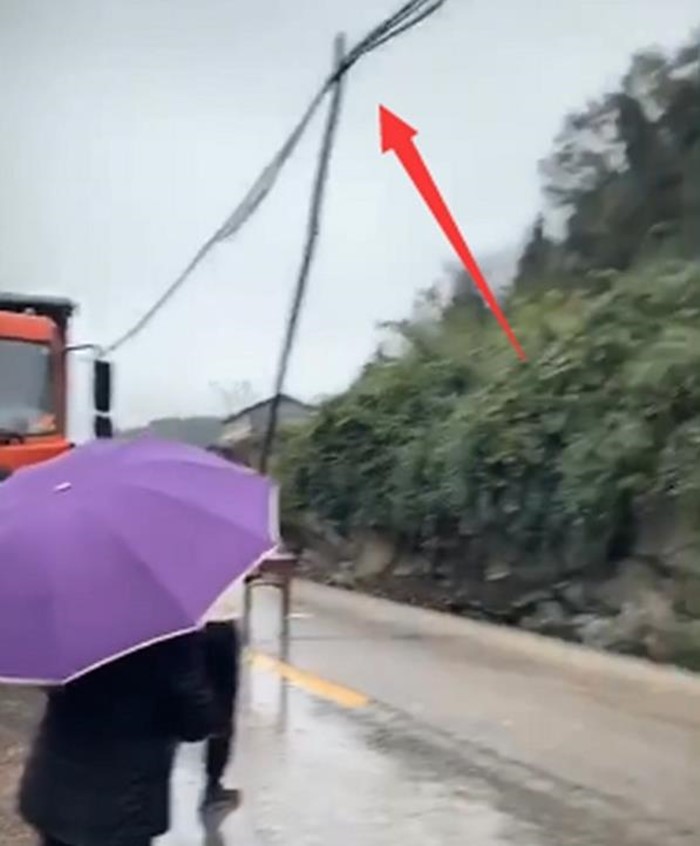 通过现场图片可以看到,一辆货车冲出路边,悬在山崖边,车前一根断裂的电杆正好拦住了货车。而村民支撑电缆的木棒足有电杆一般高,才得以让车辆正常通行。