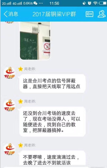 “周老师”则更为大胆。他发出一张考场图片,称是合川考点的信号屏蔽器,让考生趁考场还没有人的时候,速度过去找到自己考试的教室,把屏蔽器上的天线搞掉,“去晚了进去不到就活该。”