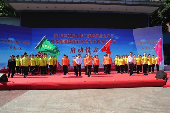 仪式上,还为技能扶贫对口单位进行了授牌,对技能进农村、进社区、进家庭的三个方阵授了旗。随后,部分技工院校、职业技能培训机构到沙坪坝区渝碚路、磁器口、覃家岗街道和凤凰镇开展技能进农村进社区进家庭活动,提供烘焙、美发、美甲、插花、家电维修等专业技能服务,举办技能讲座。