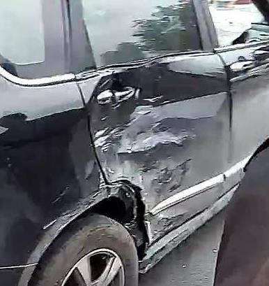 黑车的后车胎都被长安车的保险杠戳破了,瘪在了当场,整个右后车门被撞得惨不忍睹。