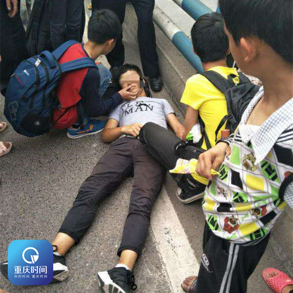在事故现场可以看到,有一位穿着灰色T恤的少年瘫倒在公路边,身旁的伙伴正在为他开展救援,周围有许多围观者。