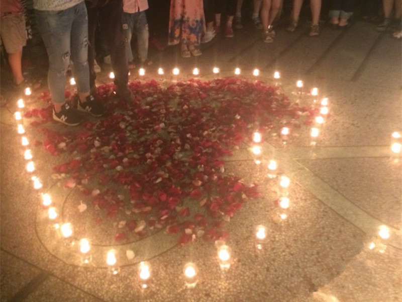 玫瑰花瓣拼成了一个心型,围绕着心型有一圈杯烛,男子单膝下跪为女子送上了一束玫瑰。