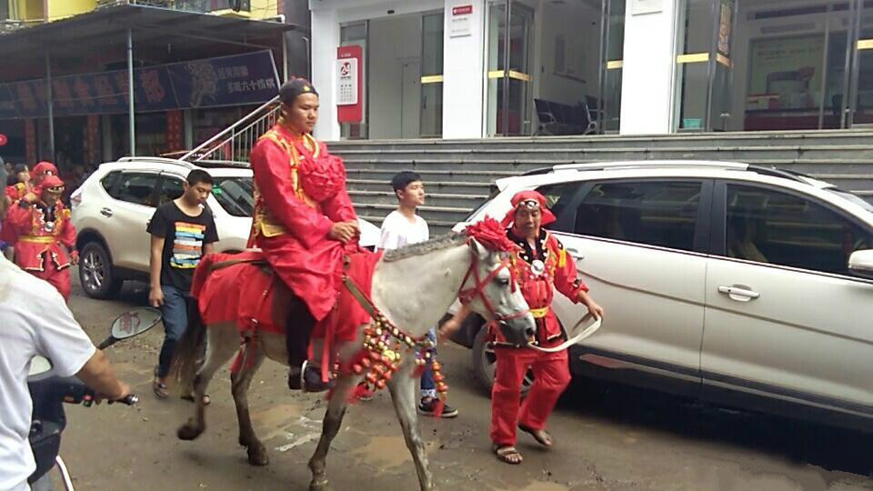 新郎骑着白马,身穿红色喜服,胸前带着大红花,从娘家接回了新娘子。