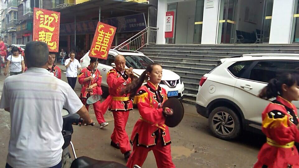 新娘子坐在轿子上,亲戚朋友背着铺盖,吹着唢呐,场面很是喜庆。