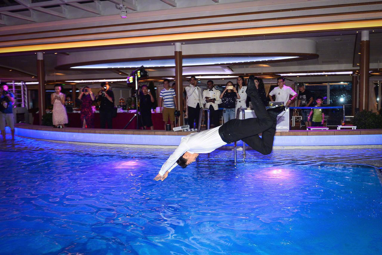 当天,真情告白之后,田亮突然脱掉西装外套,身穿白色衬衫跳入泳池中,在池底取出钻戒。