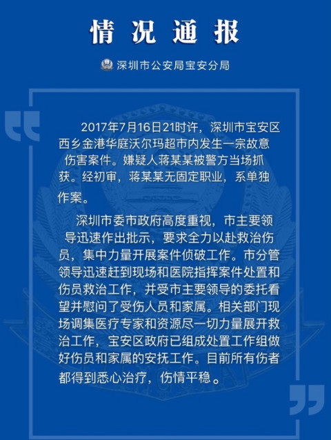 深圳警方7月16日深夜发出警情通报,2017年7月16日21时许,宝安区西乡金港华庭沃尔玛超市内,一名男子持菜刀伤人。目前已有2人死亡,9人受伤。