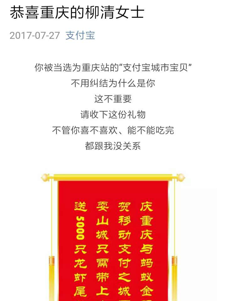 原来,重庆最近与蚂蚁金服签约共建移动支付之城,幸运用户柳女士获得支付宝送出的5000只小龙虾。