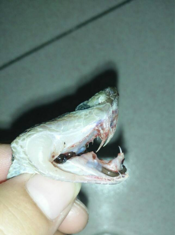 该男子把蛇嘴弄开,我们可以从图片中看到它尖尖的,半透明的牙齿,十分锋利。
