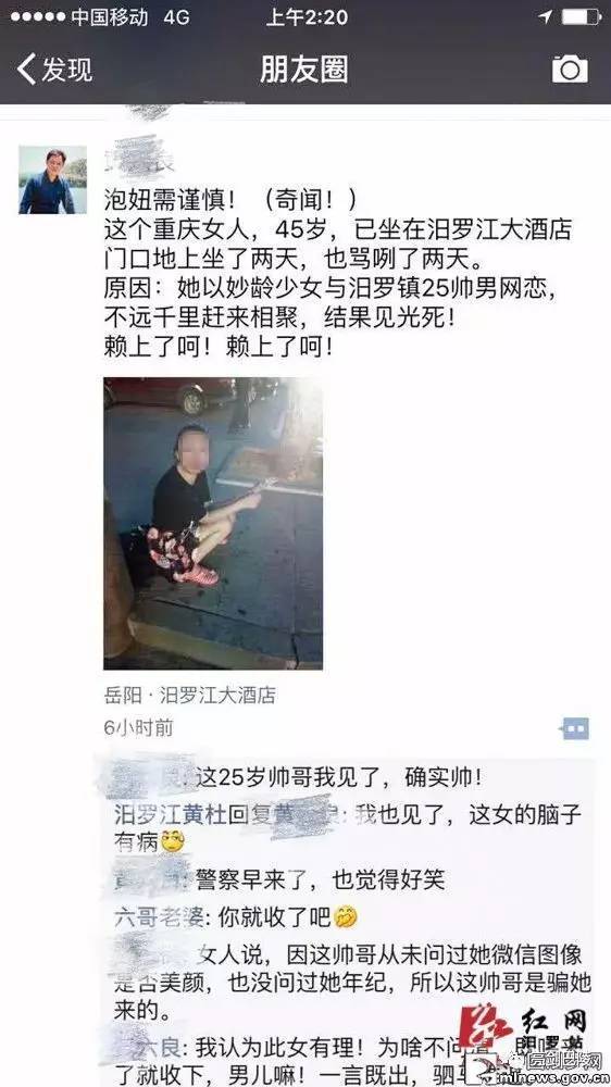 这两天,一件奇葩事火遍了汨罗人的朋友圈:一个重庆女人,45岁,已在汨罗江大酒店门口地上坐了两天,也骂咧了两天。原因:她以妙龄少女身份与汨罗镇25岁帅男网恋,不远千里赶来相聚,结果见光死!