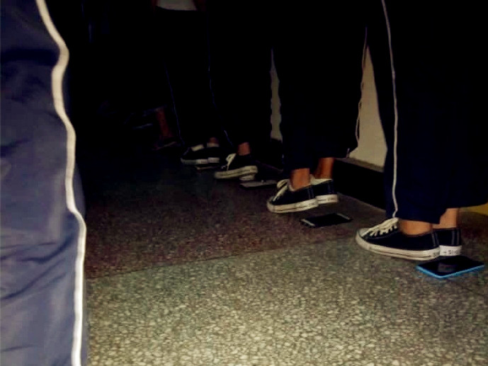 通过照片可以看到,同学们分别坐在一走廊的两端,手机则放在中间,已经都统一打开了王者荣耀。