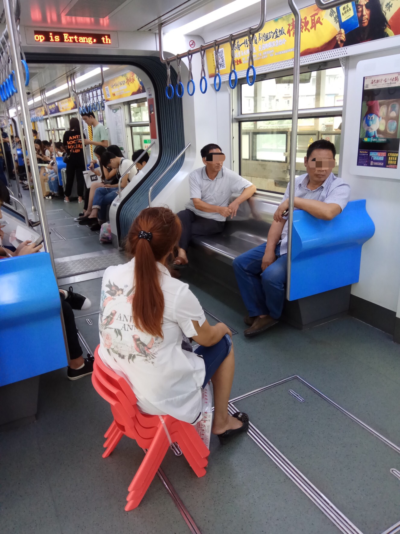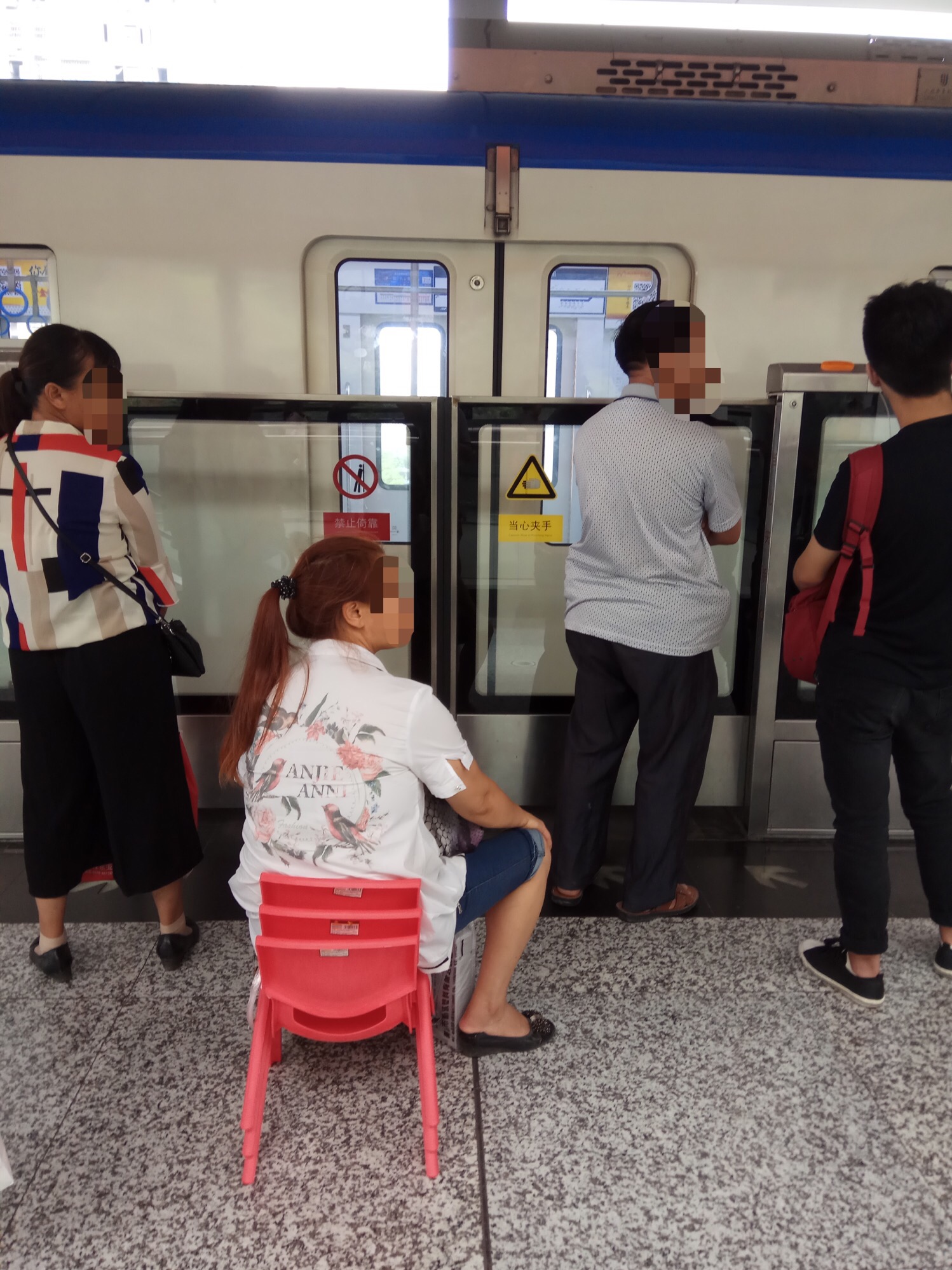 没想到,这位白衣女子也要在这里换乘,只见这名女子,从容不迫地带上自己的椅子,也来到了换乘车站前,继续把椅子放地上,坐上去,等待下一趟列车的来临。