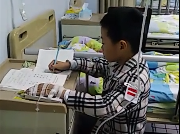 萌娃边输液边写作业 哭求护士:别扎右手影响写字