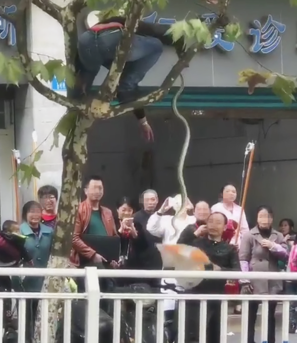 路边树上盘踞大蛇 输液男拔掉针头上树抓大蛇