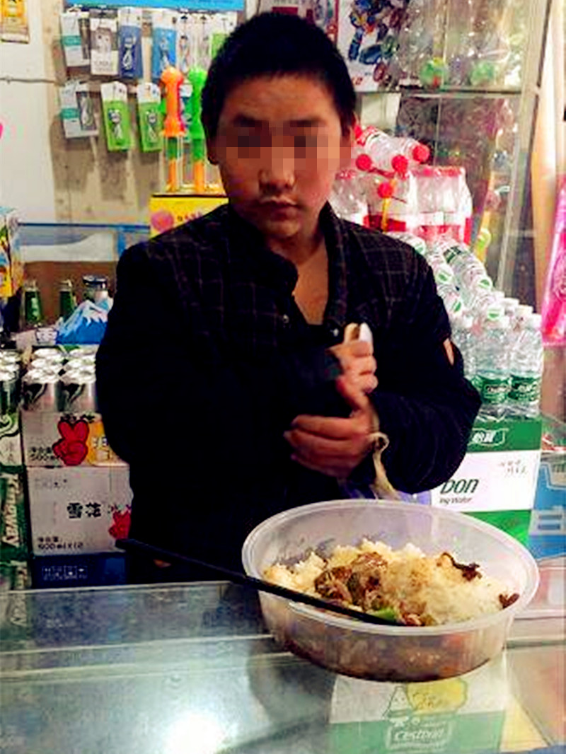 下午快14点了,附近一门店的店主给他舀来了饭菜让他赶紧吃。