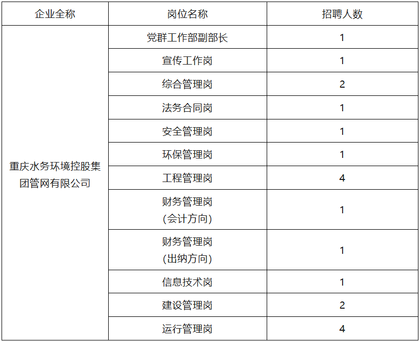 重庆水务环境控股集团管网有限公司发布公开招聘公告,招聘党群工作部副部长、宣传工作岗、综合管理岗等岗位。
