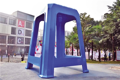 | 焦兴涛以巨型塑料板凳作为艺术创作的材料。 |