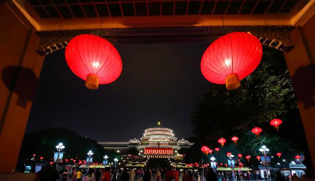 市民在重庆市大礼堂毗邻的广场上跳舞,高挂的灯笼营造出喜庆氛围。