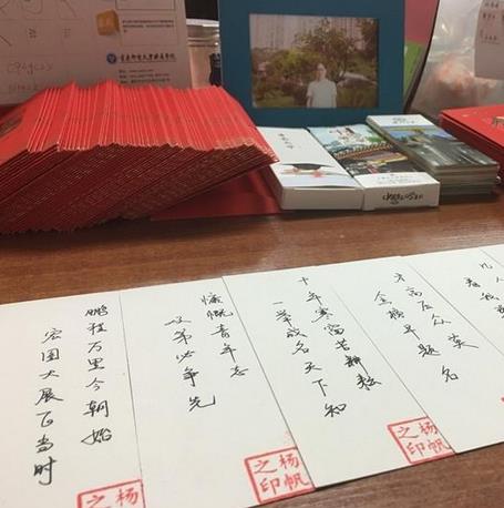 正面印有各著名大学的名称和风景,背面是杨帆老师亲手书写的祝福语。作为语文老师,杨帆选择用诗句来表达自己的祝福。其中,甚至有不少是老师的原创:“十年寒窗家国梦,一朝金榜状元郎”,“英姿飒爽战高考,捷报传来笑颜开”……