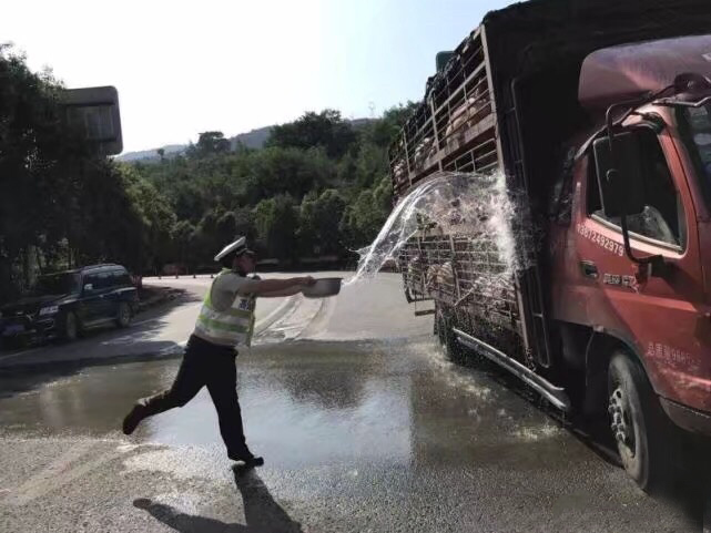 考虑到驾驶员的难处,执法人员将货车带到了草堂收费站前方的加水点给猪浇水降温。经过执法人员和驾驶员半个多小时的泼水作业,即将昏死的生猪又一个个活转了过来。
