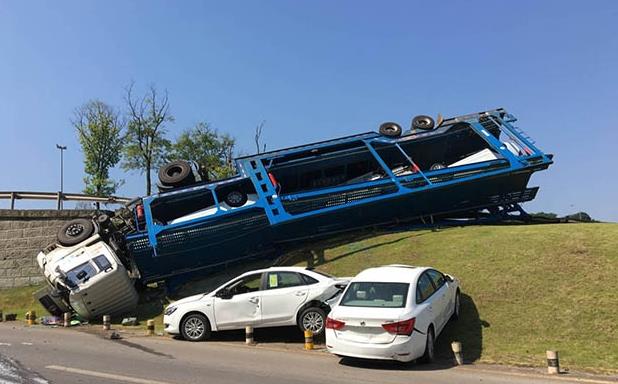重庆一运载新车的平板拖车侧翻立交桥 6辆别克受损