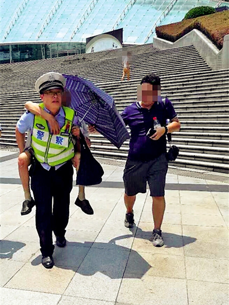 接到报警后,渝中交巡警支队大礼堂大队民警赶到现场,发现老人是中暑了,且已接近昏迷,言语不清,手和腿上也都有局部烫伤。
