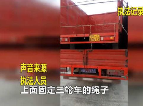 通过询问,原来这辆三轮车坏了,驾驶员想运到鱼嘴去修。为了省运费,驾驶员就直接用麻绳把三轮车固定在货车上。按照相关规定,驾驶员被处以扣1分,罚200元的处罚。