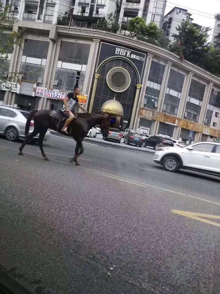 昨天傍晚5点45分左右,万州区清泉中学门口红绿灯旁,一位男子骑马等红绿灯。当绿灯亮起的时候,男子骑马通过马路。而这一幕恰好被等红绿灯的驾驶员拍了下来。