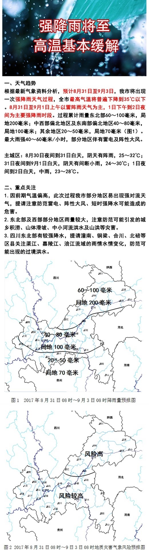 重庆气象台发布,预计8月31日至9月3日,我市将出现一次强降雨天气过程,全市最高气温将普遍下降到35℃以下。8月31日至9月1日上午以雷阵雨天气为主,1日下午到2日夜间为主要强降雨时段。过程累计雨量东北部60~100毫米,局地200毫米;中西部偏北地区及东南部偏北地区40~80毫米,局地100毫米;其余地区20~50毫米,局地70毫米。最大雨强40~60毫米/小时,部分地区伴有雷电及阵性大风。