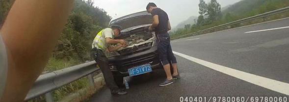 执法人员随即在故障车后方摆放了警示标志,提醒车辆注意避让。由于附近没有就近的水源,执法人员立即从车上拿出饮用水为面包车加水。降温后,面包车恢复了正常。