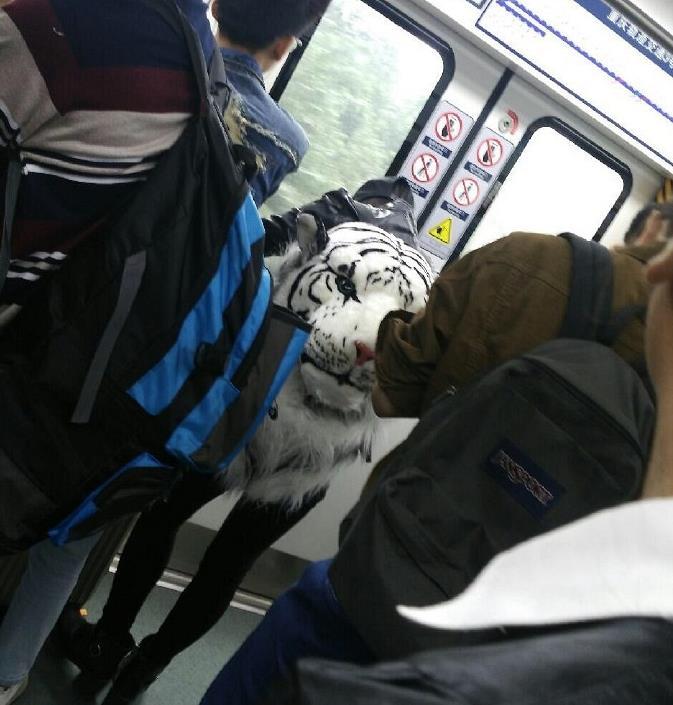 发布时间:2017-10-13 13:42:3910月13日,一则《在轻轨看到这个,都不敢靠近,就问你怕不怕?》的帖子登上重庆某论坛的首页。帖子中的照片显示:日前,有网友在轨道交通三号线乘车时,在车内发现一名休闲装扮的乘客背着的大背包是一个白虎头,站在她后面的乘客都感受着来自“老虎的凝视”。