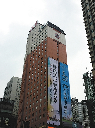 昨日上午,记者来到三峡广场,看到打有“轻轨之上 繁华尽享”的广告拉在庆泰大厦墙体上,显示为隆鑫盛世普天楼盘的广告,广告下方地址显示为“重庆九龙坡凤天大道西”。