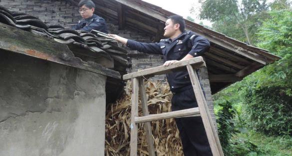 心酸不如行动,民警马上找来木梯,搬来盖房时剩下的青瓦,爬上房顶,瓦房顶是用木梁和木条搭的,有些坡度,还长了青苔很滑。民警只好跪在瓦房梁上,小心翼翼地修补漏雨的地方。一个小时后,刘大爷的瓦房顶被修缮好了,墙面几处漏风的地方也被民警用彩条布钉得严严实实。