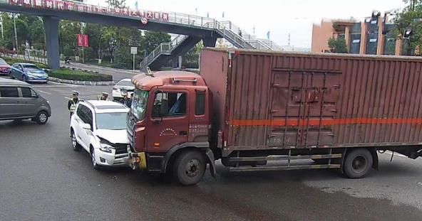 当姜某驾驶的大货车左转进入路口后,自己这方已经是红灯了,而对向车道却是绿灯,蒋某所开的白色越野车正直行过来,眼看就要对撞了,姜某吓坏了,急忙猛踩刹车,同时猛按喇叭,警示蒋某停下来让自己,但蒋某也没想到会有车辆闯红灯从对向左侧车道转弯过来,等到他猛踩刹车时,为时已晚,自己的车头猛烈地与货车撞击到了一起,所幸没有人员受伤。