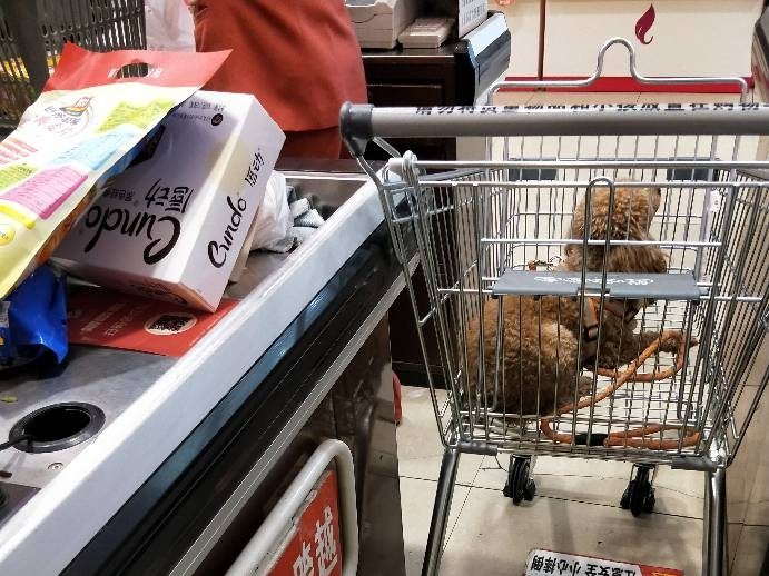 但令张小姐不解的是,突然看见有人把一只咖啡色的宠物狗放进了购物车里。宠物狗似乎很享受的样子,趴在购物车里好奇的看着周围的事物。