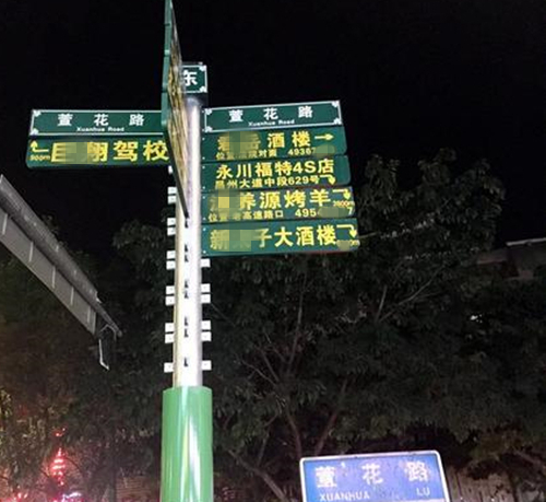 2017年12月6日,有网友爆料称,在重庆永川萱花路有一个道路指示牌,抬头看去,指示牌俨然成了一个“大广告牌”。