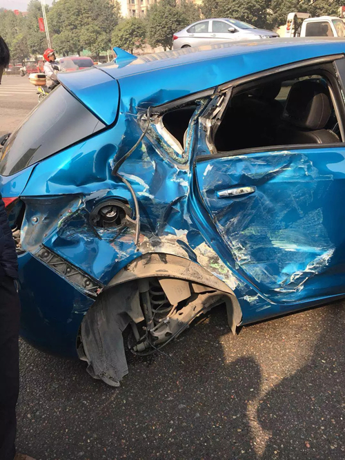 蓝色小车的后轮胎被撞掉,直接卡在了大客车车头,看着十分尴尬。车身完全变形,损毁严重接近报废。