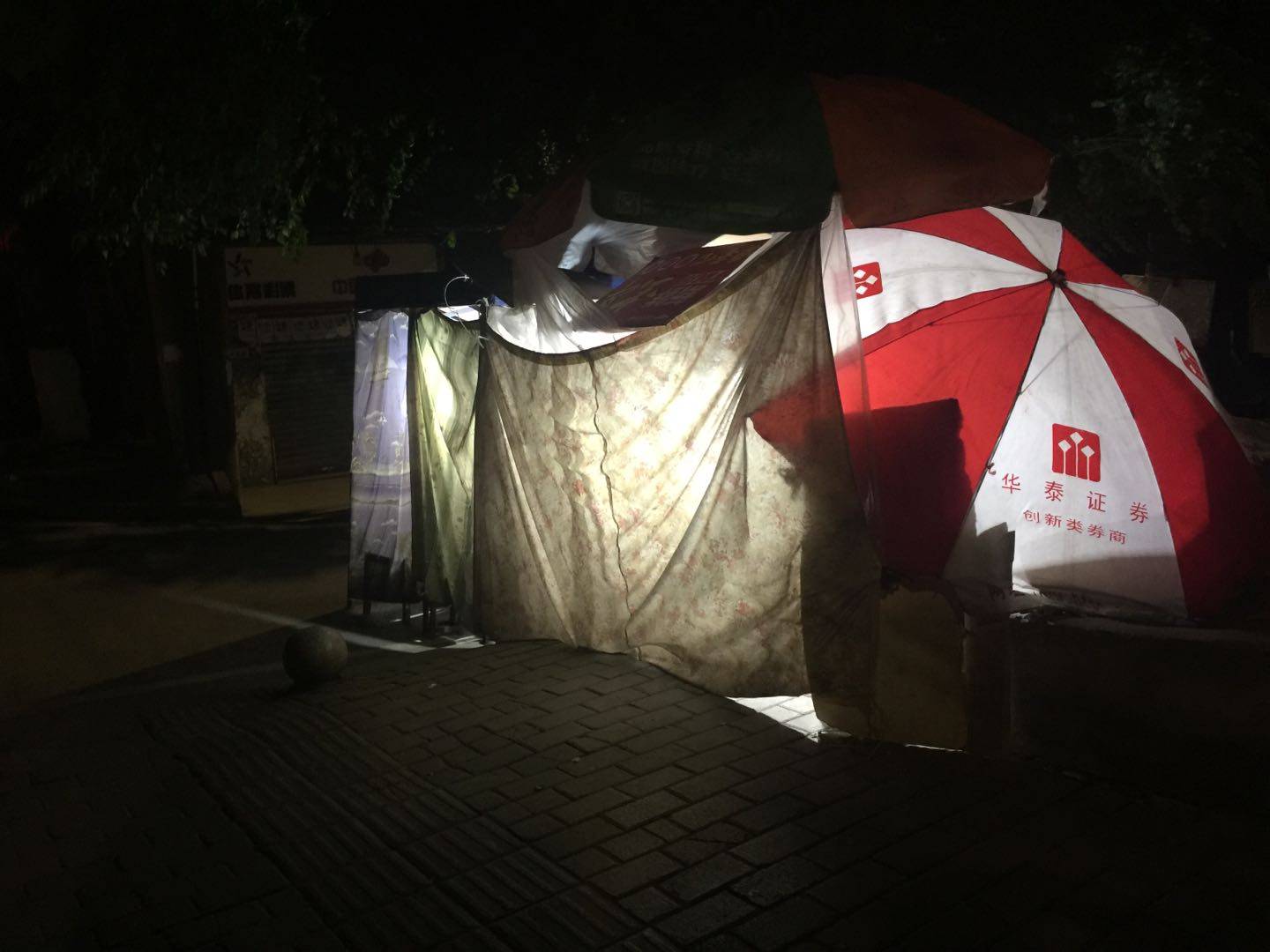 她从一堆货物底下,把几块塑料薄膜和窗帘布拿出来,还拖出了一把写有“华泰证券”的巨型遮阳伞,把它们围在自己的摊子周围。