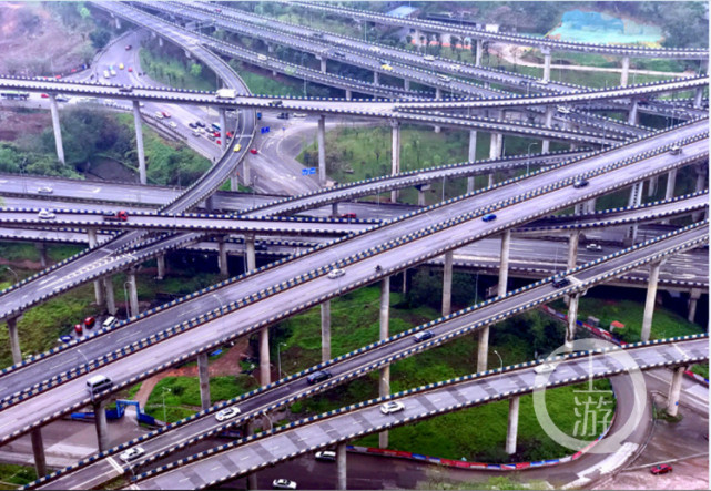 从空中观察,黄桷湾立交就象一张大蜘蛛网,密密麻麻的匝道分为了5层,一层一层地往上叠,像“叠罗汉”一样向8个方向延伸而去。