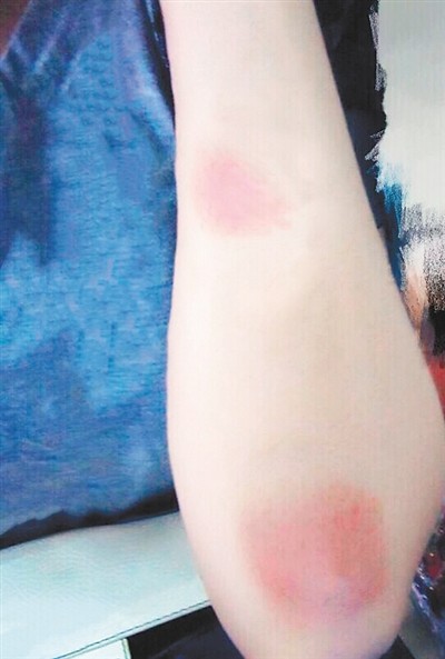 杨晴晴的右边手臂上有一块淤青,据她讲是几天前男友拿凳子砸她时,她用手挡留下的。