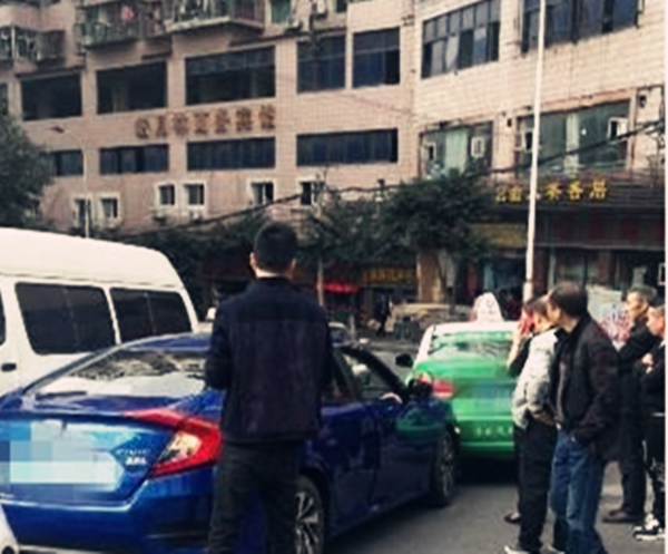 从爆料网友提供的图片来看,这条公路并不是很宽阔,此时蓝色私家车的车头与出租车车尾“亲密接触”紧紧相依,停在公路一边。私家车旁边围了很多围观的路人,司机也被迫下车,及时处理此事,但追究于事故责任,一直推脱,不承认是自己的原因造成的追尾。
