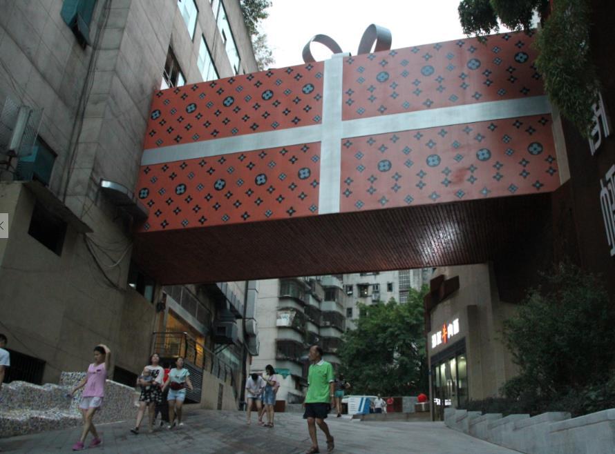 2017年8月16日,重庆九龙坡区杨家坪一建筑走廊悬在半空中,外形酷似一个巨型“礼品盒”。
